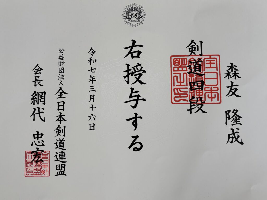 3月の昇段審査で、剣道四段に合格し、証書が届きました!